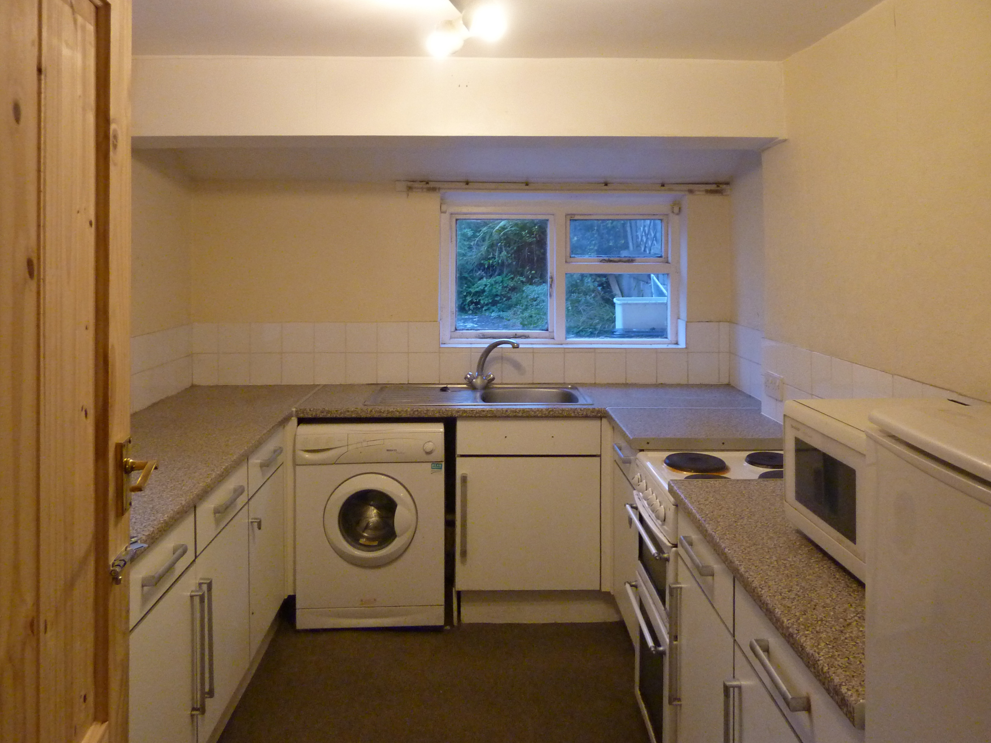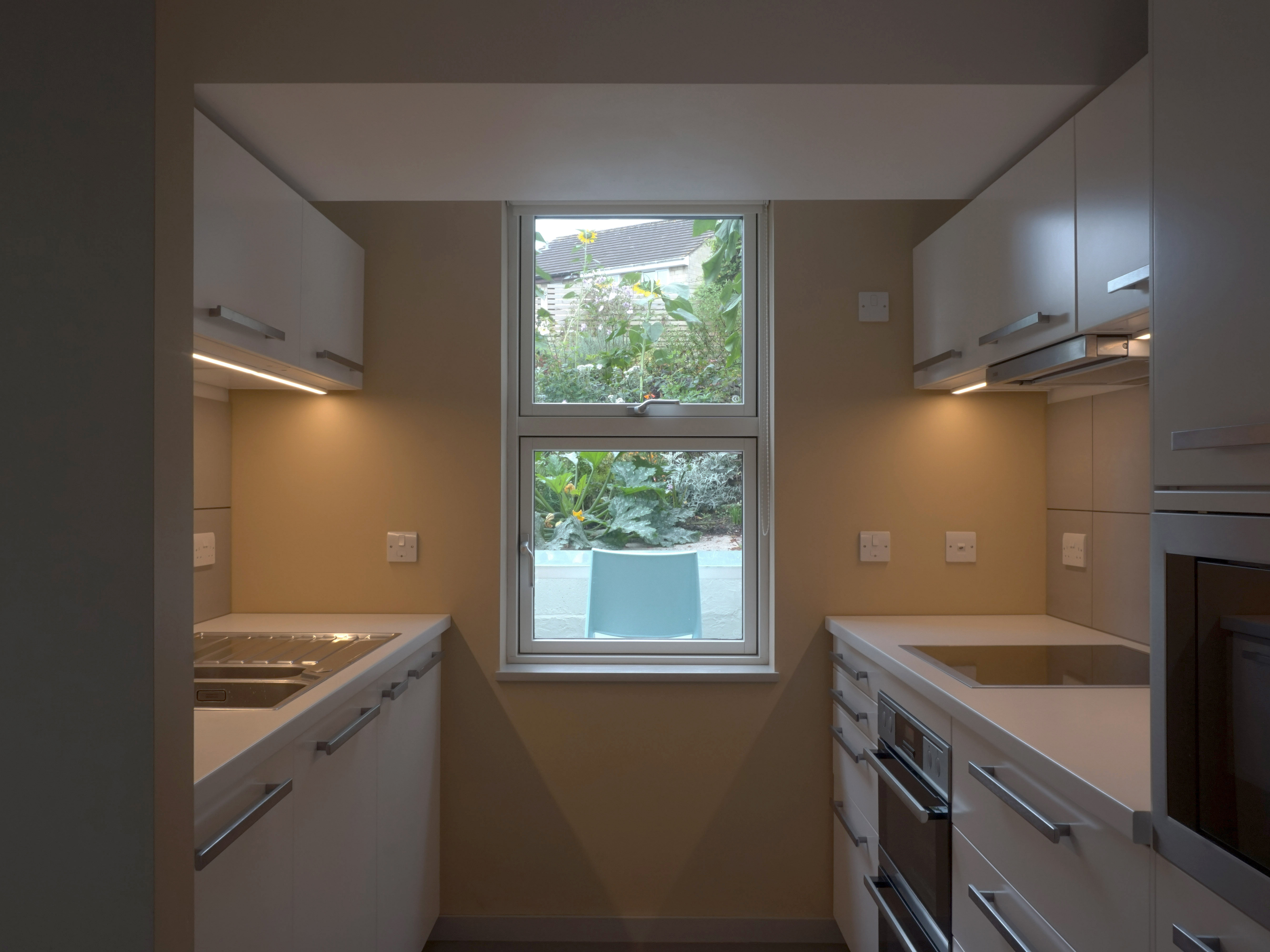The existing extension was remodelled: a new flat roof with a parapet allowed the ceiling height to be increased, and the window opening was reconfigured to give better light levels and a view of the garden.